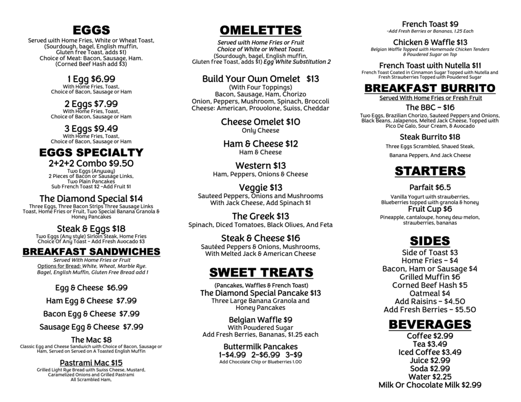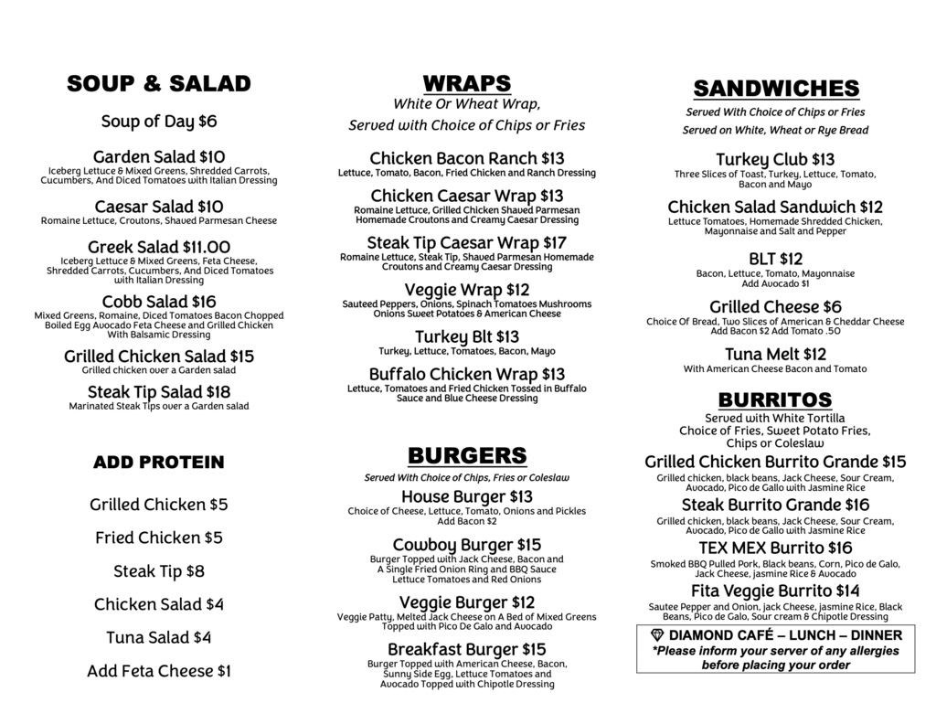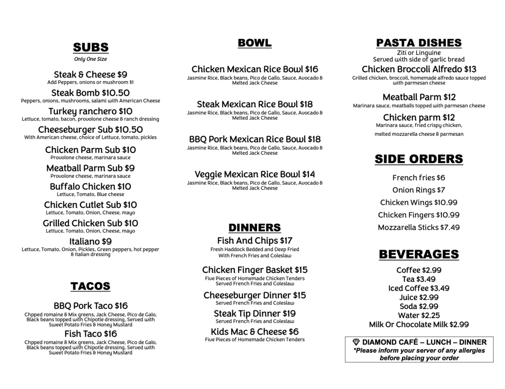 At Diamond Cafe, we bring people together over great food, cozy vibes, and a touch of sparkle. Whether you're craving something warm and hearty or cool and refreshing, there's always something special waiting for you here.
